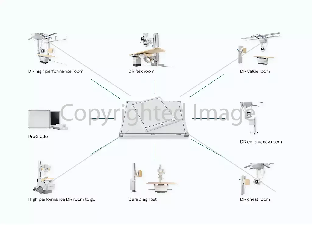 DuraDiagnost масштабується від економічної конфігурації з одним бездротовим детектором до ефективного дводетекторного кабінету — для швидкого переходу на цифрову рентгенографію або розширення наявних потужностей.